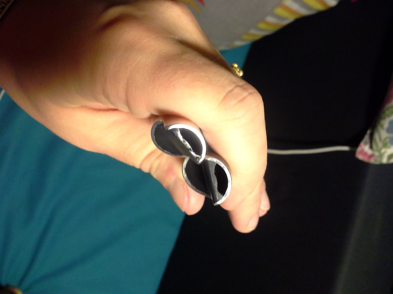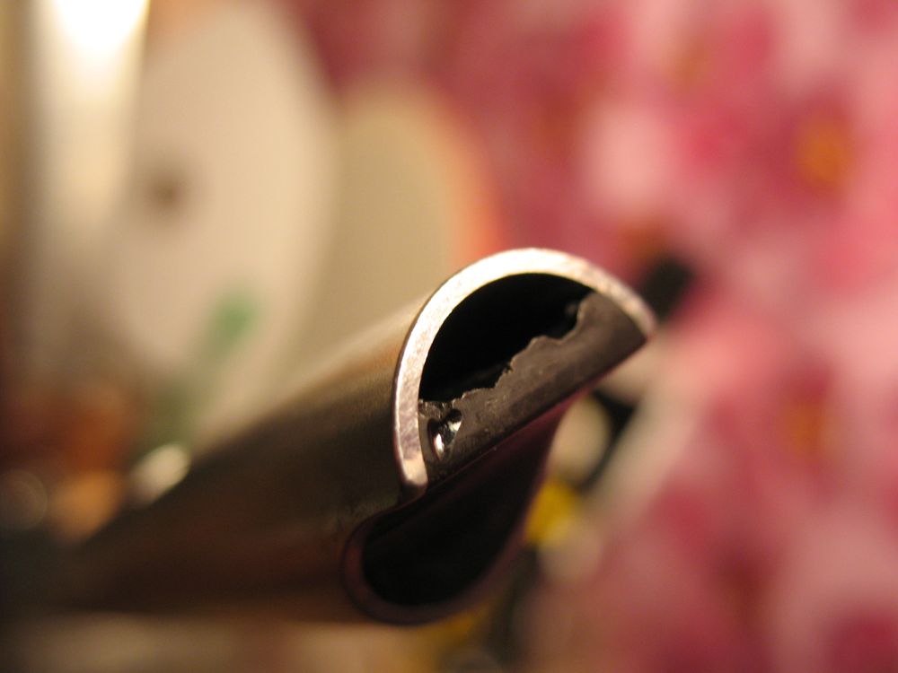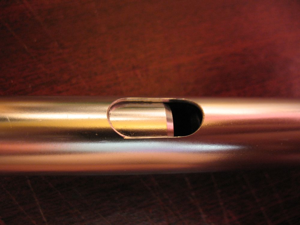 Никаких обозначений на висле нет, и понять, в какой он тональности - достаточно трудно. Трубка тонкая, гораздо тоньше, чем у алюминиевых вислов типа Голди и т.д., внутренний диаметр такой же как и у дошного Джеререйшна. Пробка из черного пластика. Вот тут внезапно обнаружился странный косяк - вход в виндвей очень неровный, как будто мастер пилил пробку надфилем, бормашиной или стамеской. Примерно две трети пола виндвея внутри выглядит вот так перепаханно. Понятно, что таким образом мастер старался как-то подогнать виндвей до нужных параметров, но, при такой цене, и позиционировании вислов как хай-энд, подобный неэстетичный способ обработки очень контрастирует с общим видом висла и, честно говоря, вызывает недоумение.